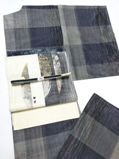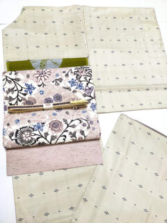 こちらはうって変わって優しい絹鼠色の地に飾り格子が織り出され、どことなく琉球の織物を思わせるデザイン。