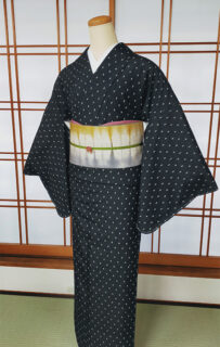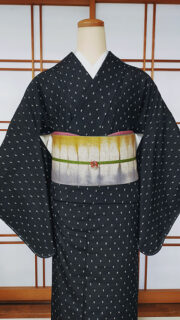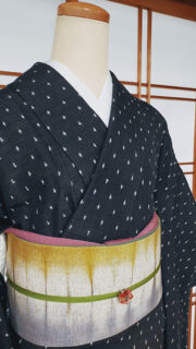 先日、秋コーデをご紹介いたしました、黒地に絣柄を染めた珍しい小紋。