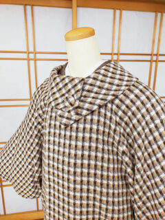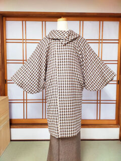 茶色がベースなので格子デザインも優しい印象、お着物と合わせやすいと思います。