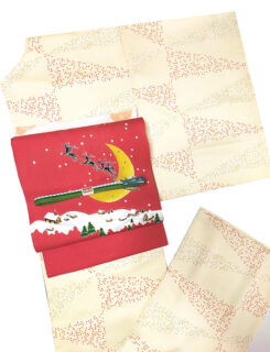 赤、黄色、グレーのドットで描かれた幾何学模様の小紋と合わせて