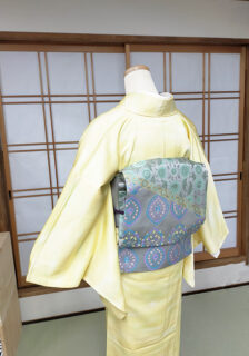 淡いレモンイエローの霞暈しの色無地に合わせた