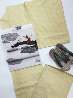 少しだけくすんだ淡い黄色の大島紬に、wakkaさんの名古屋帯を合わせました。