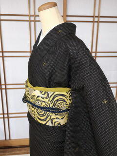 深みのある黒茶色の地に、細やかな蚊絣と星のような柄。