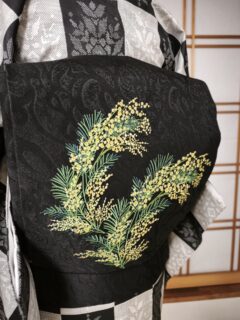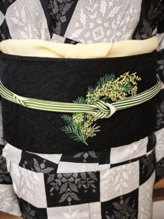 今日のコーディネートはミモザの名古屋帯です。