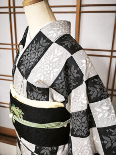 お着物は白と黒の大きな市松柄が特徴的な紬。