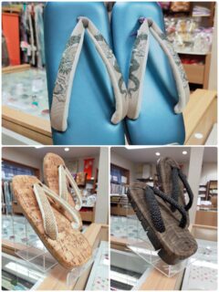 龍の刺繍鼻緒やコルク地のお草履、烏の畳表の八ツ割り下駄