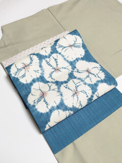 柔らかい薄緑の紬にパキッとした花浅葱色の桐生絞の帯。