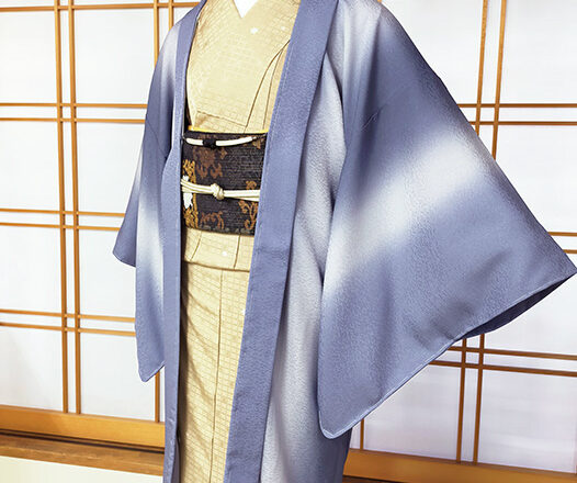 今日は前回の黒系とはガラッと雰囲気の違った羽織です♪ ぼかしが効いていて地紋の光沢感とも相まって上品な雰囲気のお品。 グラデーションが色彩を柔らかくみせてくれて 着姿も落ち着いていて美しい印象です。 色同士が綺麗に見えるよう考えてぶっつけと呼ばれる並びでお仕立てをしました。 同じぼかしのもので道中着や道行もご用意しています。 裂取文の創作江戸小紋の羽織も 淡いグレーの染め…