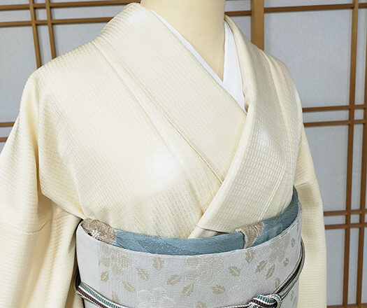 今日のトルソーさんは ☆蛍ぼかし 小紋 ☆織工房真古都 名古屋帯 やわらかなクリーム地のお着物に 帯もやさしい絹鼠色の地色。 [caption id="attachment_20493" align="alignnone" width="240"] とっても上品な柔らかな組み合わせ。[/caption] そして帯揚げを利かせ色に♪ 全身すっきりとした印象です。 女…