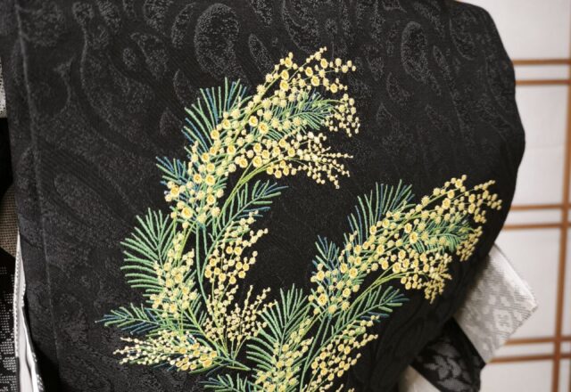 真っ黒な地にやさしい黄色のお花。 今日のコーディネートはミモザの名古屋帯です。 春先に咲くミモザのお花は、暖かな色味で見ているとなんだか和みますね。 こちらの帯はお花の色味、葉っぱの形など特徴をとらえた素敵な一品です。 黒地に黄色と緑色がよく映えますね! 光に当たると地紋がキラッと見えるので黒地でも のっぺりした印象にならないのがいいですね。 お着物は白と黒の大きな市松柄…